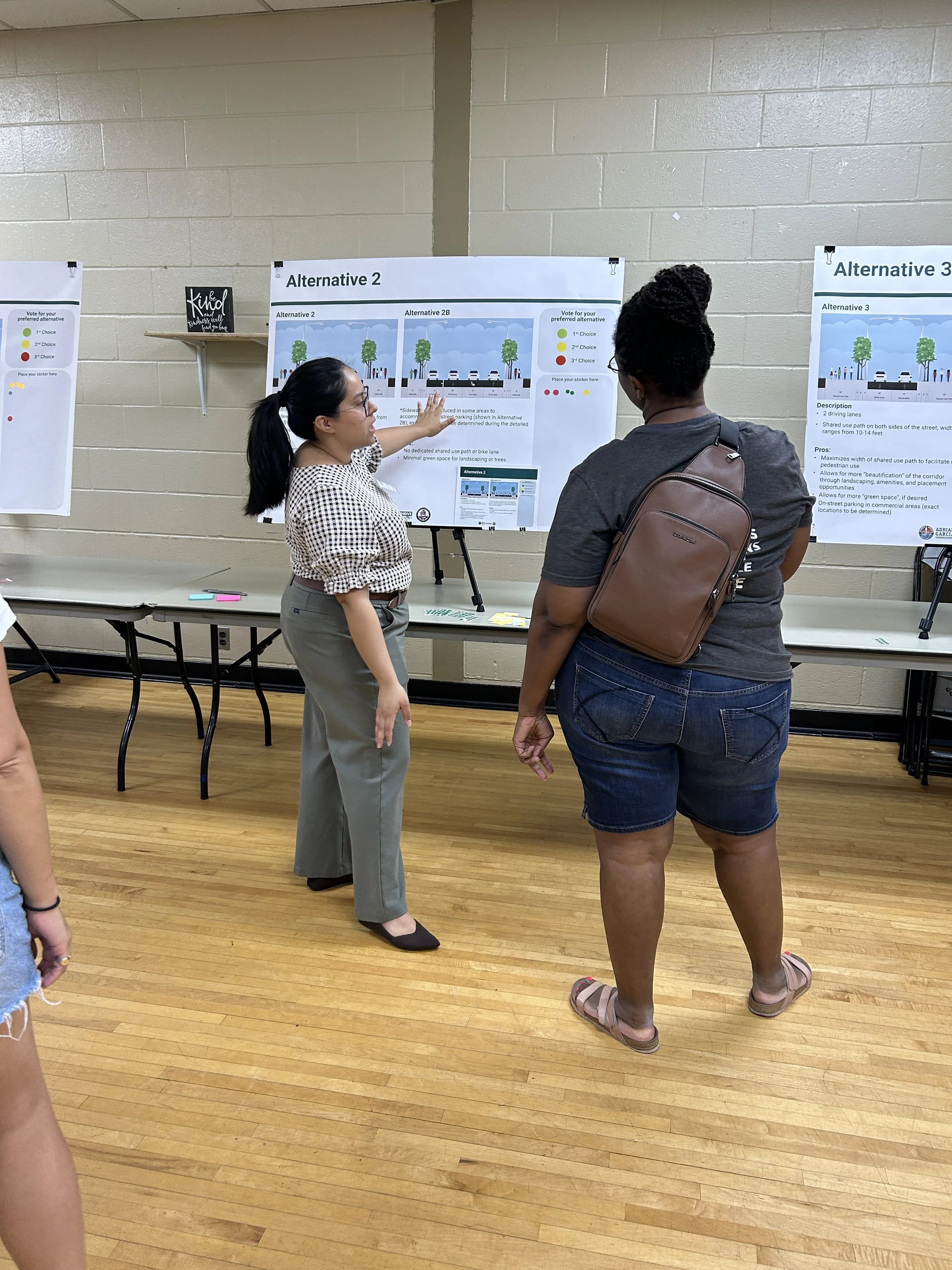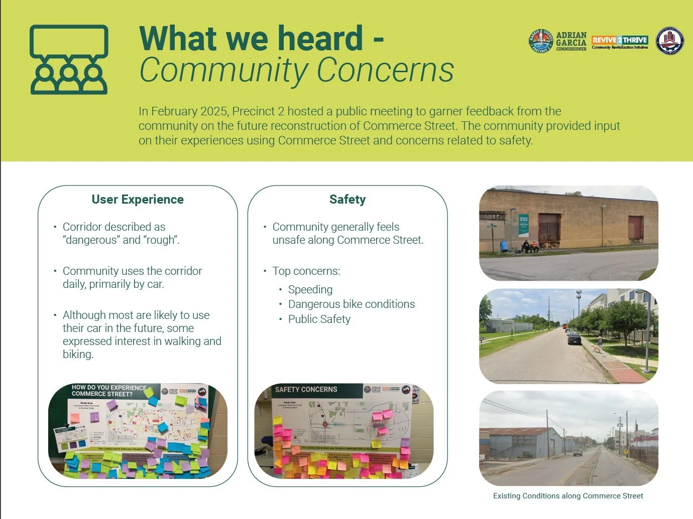 Over 35 individuals joined us for the second Community Meeting, held September 10, 2025, at Settegast Community Center. Participants had the opportunity to provide feedback on three design alternatives for Commerce Street, preferences for on-street parking regulations on Commerce Street, as well as completing a survey and comment card.